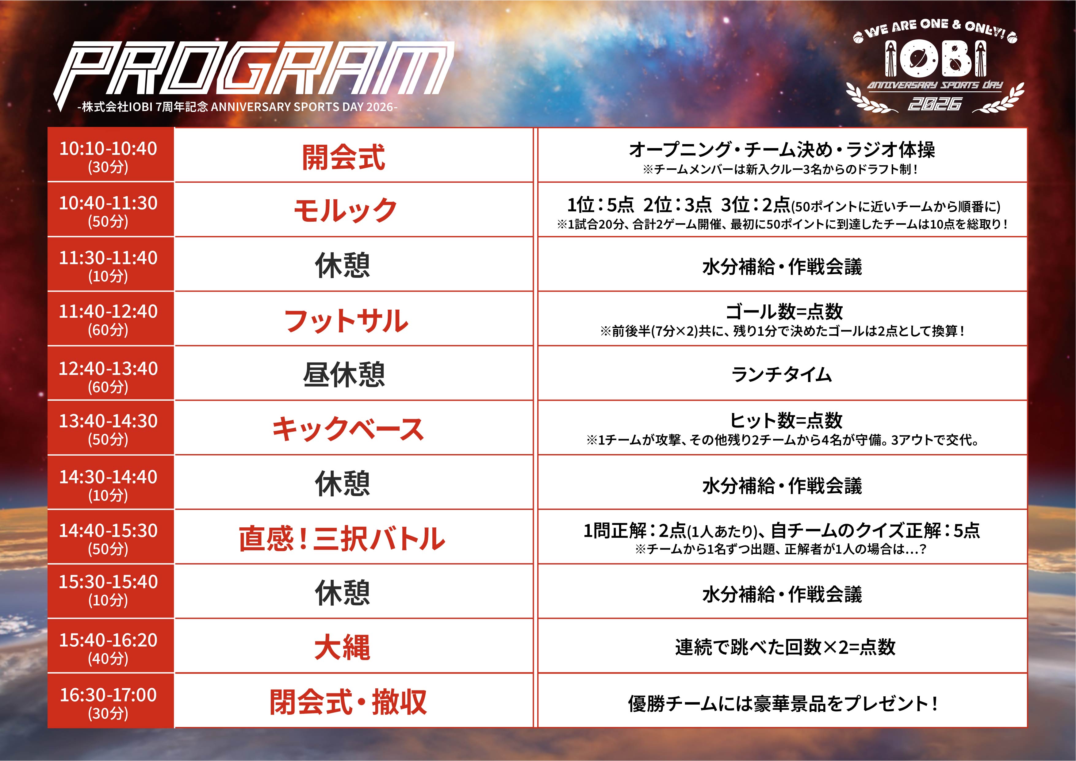 そこで今回は屋内フットサルコート「キャプテン翼スタジアム生野」を1日お借りし、7周年記念運動会を開催いたしました。