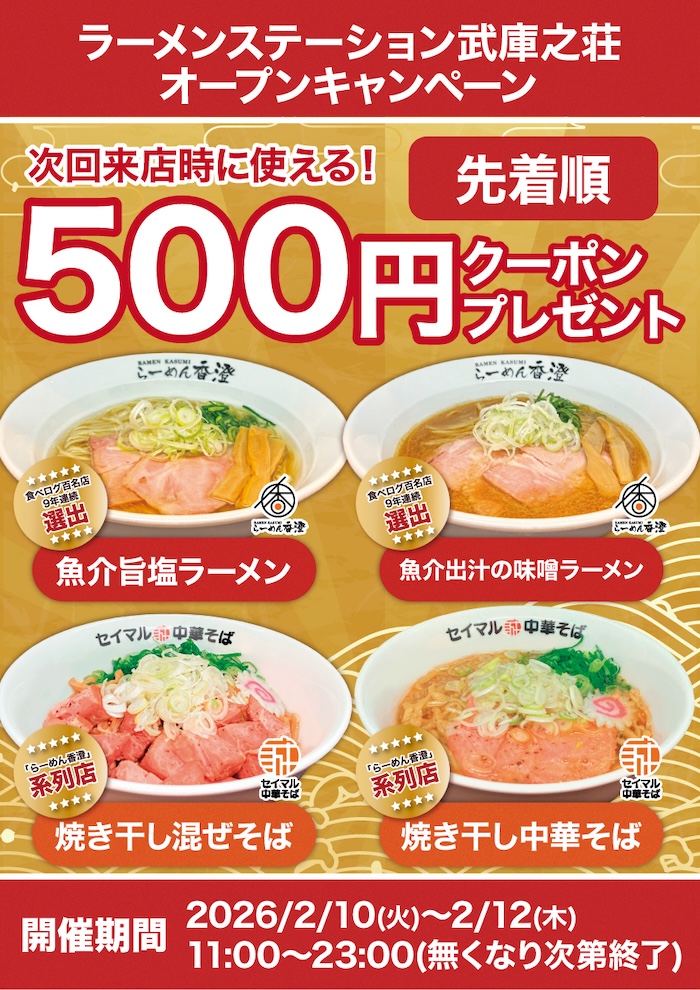 さらに、オープン初日の2月10日(火)から2月12日(木)までの3日間は、次回来店時にご使用いただける500円クーポンも配布いたします。