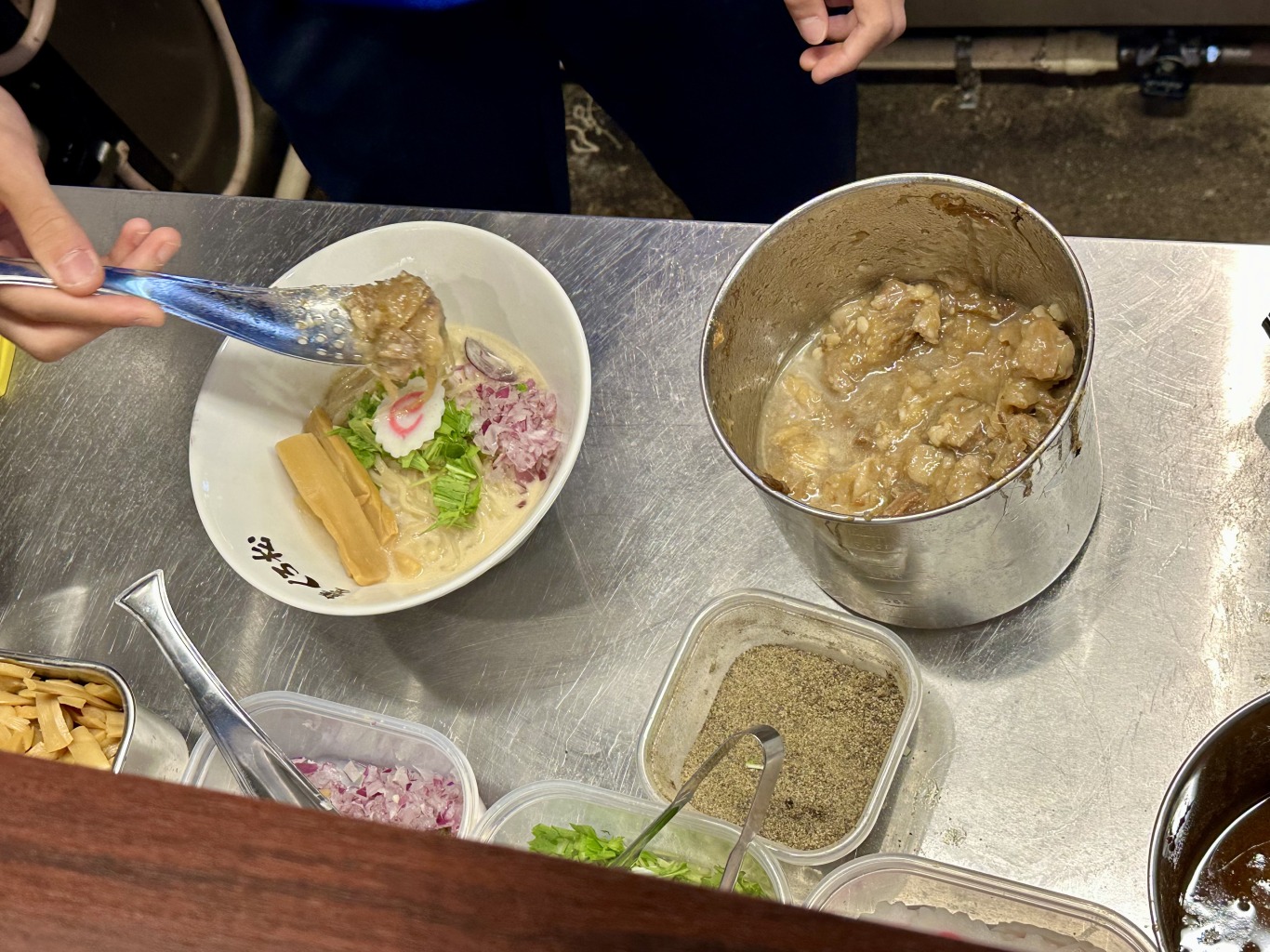 ラーメンステーション東三国店にて大好評の牛骨白湯ラーメンを店舗スタッフから教えてもらいながら作り、キッチンは終始和気あいあいとした空気に包まれていました。